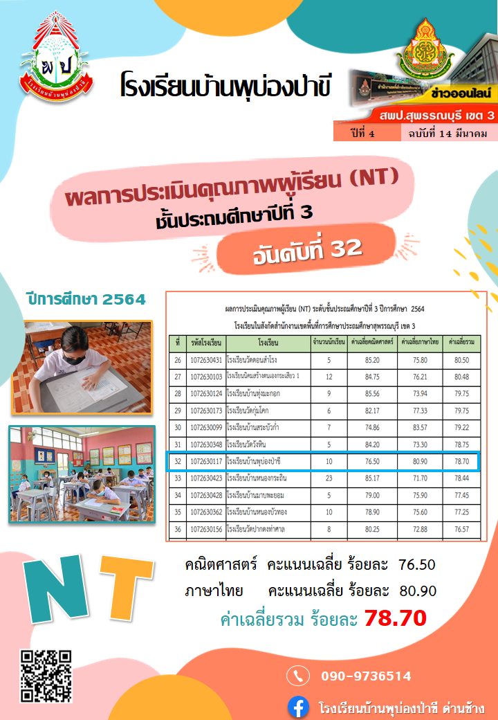 ผลการประเมินคุณภาพผู้เรียน (NT) ชั้นประถมศึกษาปีที่ 3 ปีการศึกษา 2564
