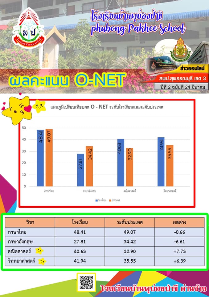 ผลคะเเนน O-NET นักเรียนชั้นประถมศึกษาปีที่6 โรงเรียนบ้านพุบ่องป่าขี ได้ 2 ดาว ????